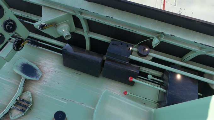 To the left are the power controls. The black metal lever on the wooden throttle fires the plane’s guns. The two red-knob levers below them are bomb releases.