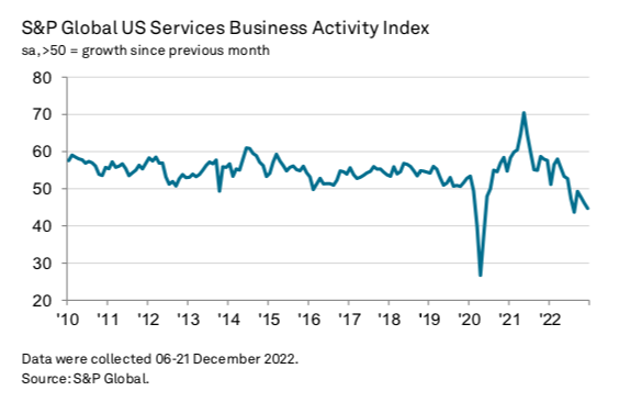 The S&P US Services PMI fell -1.5 points in December, falling deeper into contraction at 44.7. Unlike the ISM, this index already showed the US service sector entering contraction a few months ago.